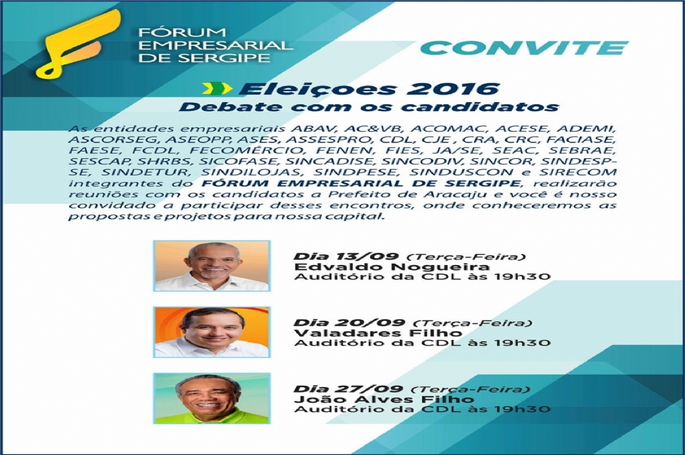 Nos dias 13, 20 e 27 de setembro o Fórum Empresarial de Sergipe, representando 34 entidades, recebe os candidatos mostrando um grande momento do setor empresarial. Unido, o setor realizará apenas um evento com cada candidato, otimizando o tempo e facilitando assim, a participação dos associados de cada entidade. Para reduzir custos, apenas os três melhores candidatos nas pesquisas serão entrevistados.