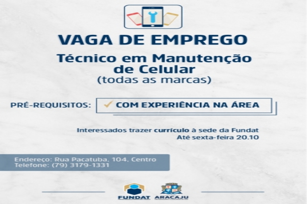 A Fundação Municipal de Formação para o Trabalho (Fundat), por meio da Agência do Trabalhador, está com vaga de emprego para o cargo de técnico em manutenção de celular (todas as marcas). Para participar do processo seletivo, é necessário ter experiência na área.