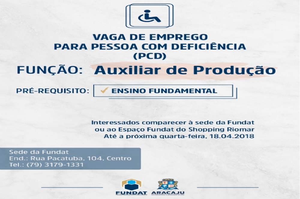 A Agência do Trabalhador, setor da Fundação Municipal de Formação para o Trabalho (Fundat) responsável pelo encaminhamento ao mercado de trabalho, informa que está com mais vagas de emprego destinadas à pessoa com deficiência. A função é de auxiliar de produção e para se candidatar ao cargo é necessário ter o Ensino Fundamental.