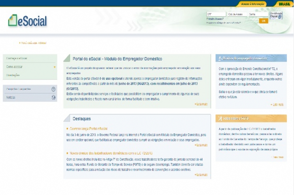 O novo sistema registrará das informações do trabalhador a partir deste mês, com vencimento do recolhimento da contribuição previdenciária em julho. O portal, no entanto, não registrará benefícios aprovados pelo Congresso que ainda precisam ser regulamentados, como o Fundo de Garantia do Tempo de Serviço (FGTS), auxílio-doença, seguro-acidente de trabalho e seguro-desemprego. Operado pela Caixa Econômica Federal, o recolhimento do FGTS dos domésticos continua sendo opcional.