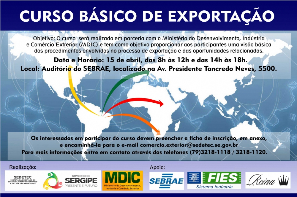 O curso é gratuito e para participar os interessados devem solicitar a ficha de inscrição através do e-mail comercio.exterior@sedetec.se.gov.br. “Esta é uma capacitação que faz parte do Plano Nacional da Cultura Exportadora e tem como objetivo difundir a cultura exportadora nos Estados. Nesse sentido, a participação do público é muito importante para melhorar o desenvolvimento do comércio exterior em Sergipe”, destacou o analista de Comércio Exterior da Sedetec, Caio Lucas de Moura Morais.