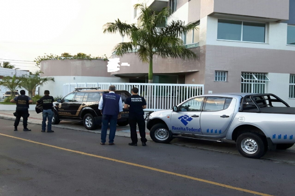 | Agentes da Polícia Federal na porta do contador onde foram apreendidas vasta documentação (Foto: Ascom Receita) |