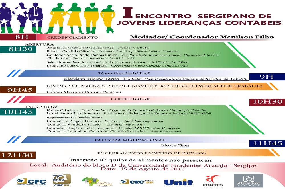 No próximo sábado, dia 19 de agosto, acontecerá na Universidade Tiradentes o I Encontro Sergipano de Jovens Lideranças Contábeis, o encontro que será comandado pelo jornalista Menilson Filho acontece das 8h às 12h no auditório do bloco D da UNIT Farolândia.