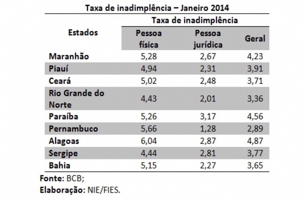 A taxa situou-se em 4,44% dos contratos de crédito, com atraso superior a noventa dias nos pagamentos, ficando bem próximo da menor taxa da região, que ocorreu no Rio Grande do Norte (4,43%). Para as pessoas jurídicas a taxa registrou atraso em 2,81% dos contratos.