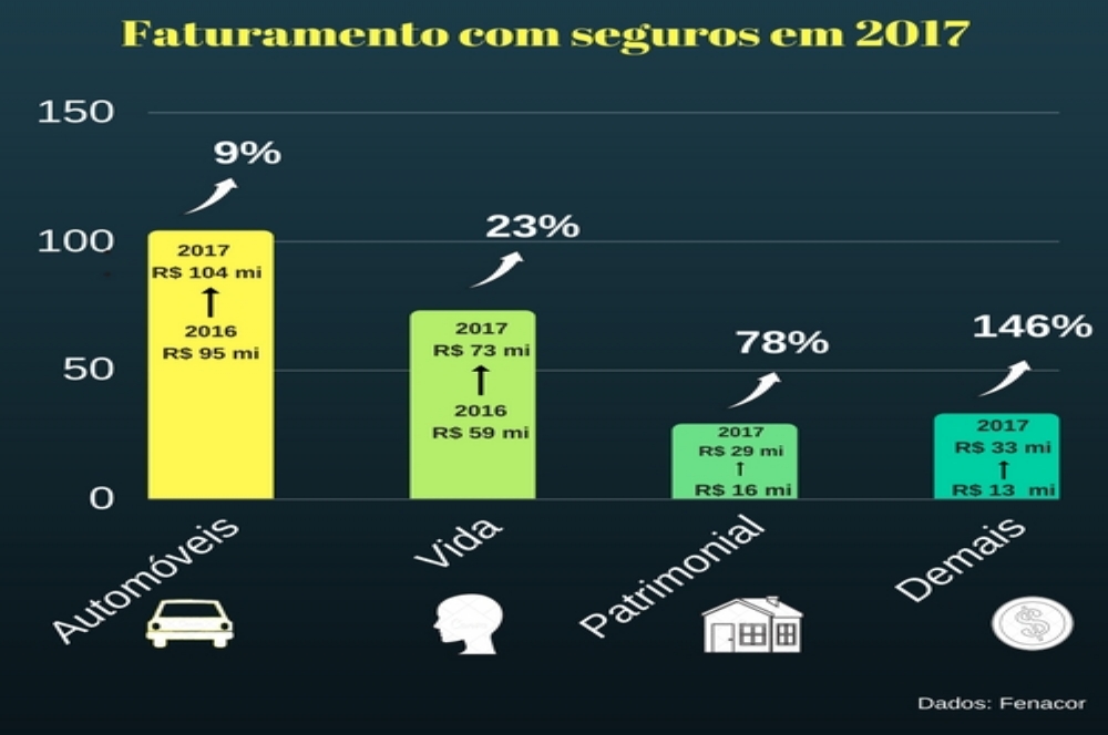 | Dados da Susep, divulgados pela Fenacor, mostram crescimento do mercado de seguros de 2016 para 2017 (Arte: Ícaro Novaes) |