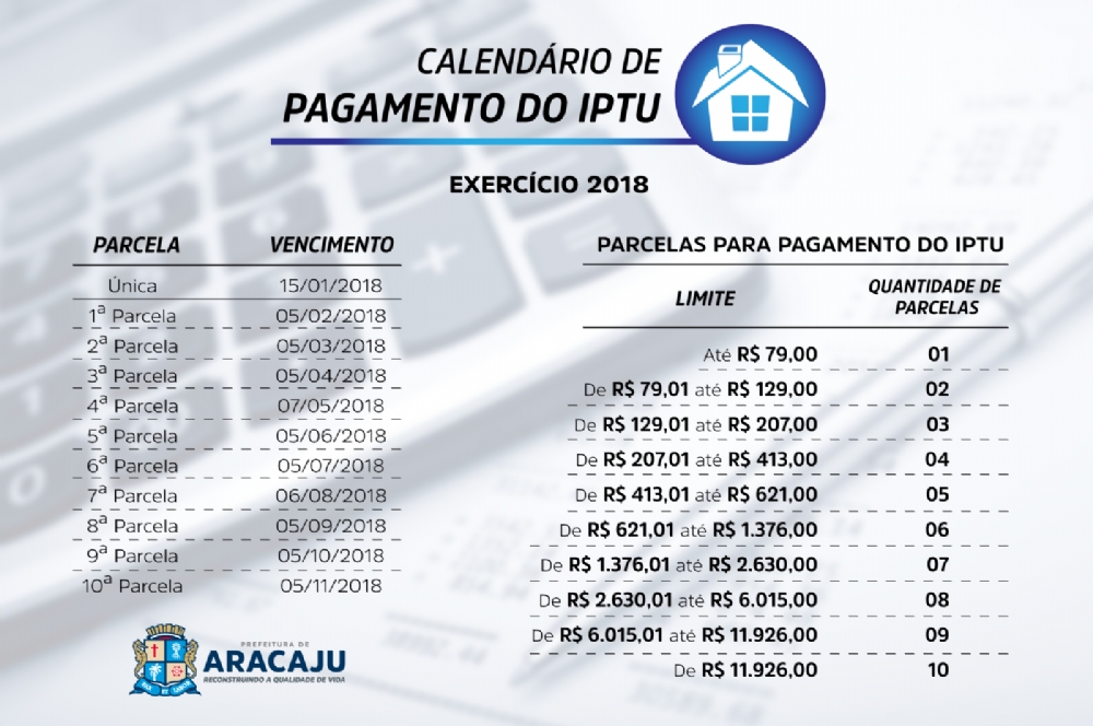A Secretaria Municipal da Fazenda (Semfaz) divulga o calendário de pagamento do Imposto Predial Territorial Urbano (IPTU) para o exercício 2018, estabelecido através do decreto Nº 5.615, sancionado pelo prefeito Edvaldo Nogueira e publicado no Diário Oficial. Os boletos deverão ser entregues à população a partir do dia 1º de janeiro, quando também estará disponível no Portal da Prefeitura de Aracaju a versão digital do documento, para impressão.