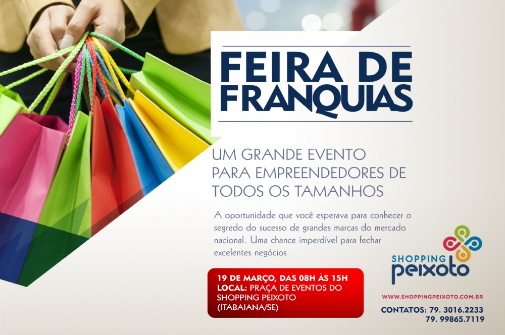 Olhando a realidade sob esse prisma, sem jamais perder o otimismo, a cidade serrana vai sediar, no dia 19 de março, na praça de eventos do Shopping, das 8h às 15h, a Feira de Franquias. Algumas das marcas mais bem sucedidas do mercado nacional, em todos os segmentos do varejo, estarão com condições e vantagens imperdíveis para novos franqueados. A iniciativa é do Shopping Peixoto que tem o propósito de atrair novos parceiros, locais e regionais.