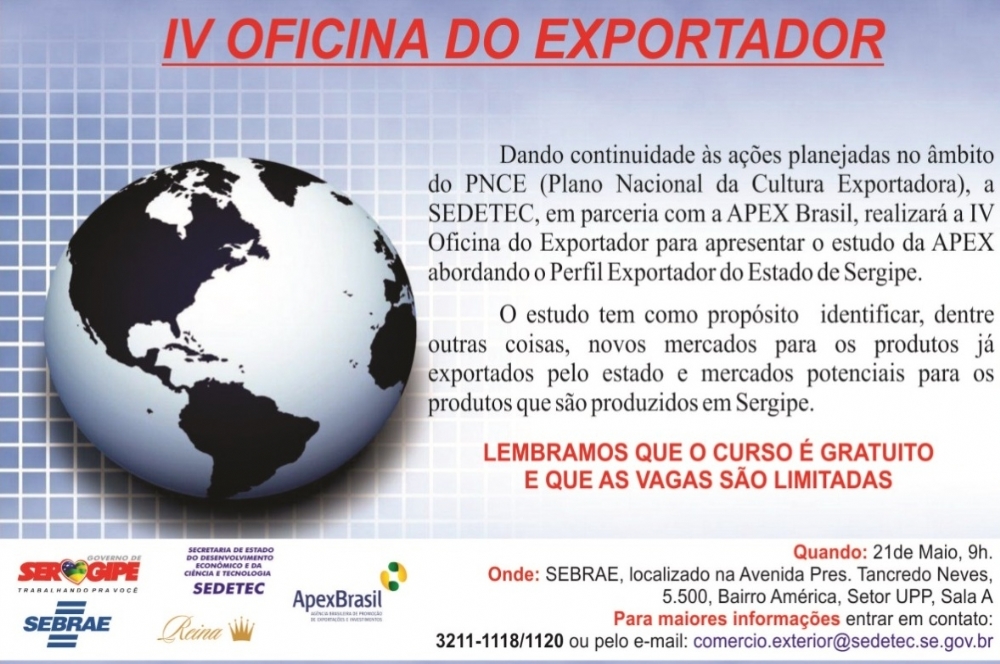 Como parte do Plano de Nacional de Cultura Exportadora (PNCE), a Secretaria de Estado do Desenvolvimento Econômico e da Ciência e Tecnologia (Sedetec), oferece no próximo dia 21 de maio, às 09h, a ‘IV Oficina do Exportador’. O evento, que acontece no auditório do Sebrae, tem como objetivo identificar, entre outras coisas, novos mercados para os produtos já exportados pelo Estado e mercados potenciais para os produtos que são produzidos em Sergipe.