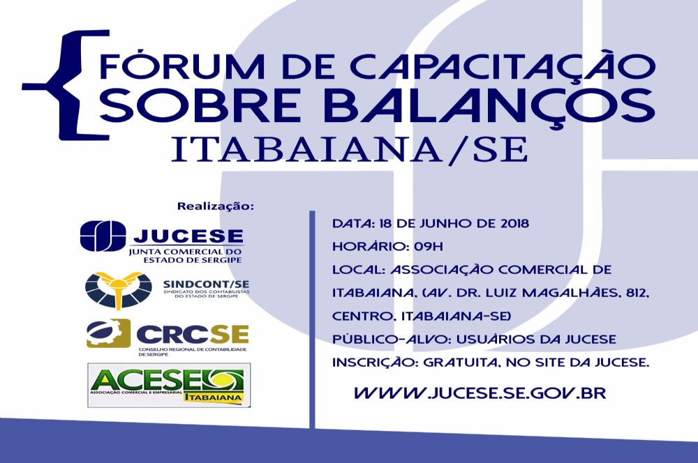 Zelosa em esclarecer as dúvidas de todos os seus usuários e atendendo aos pedidos dos profissionais da Contabilidade, a Junta Comercial do Estado de Sergipe (Jucese) realizará mais uma edição do Fórum de Capacitação sobre Balanços. Desta vez, o evento educacional ocorrerá na cidade de Itabaiana, no auditório da sede da Associação Comercial e Empresarial (localizada na Avenida Dr. Luiz Magalhães, 812, Centro), no dia 18 de junho, às 9h. Os interessados devem se inscrever gratuitamente no site da Jucese.