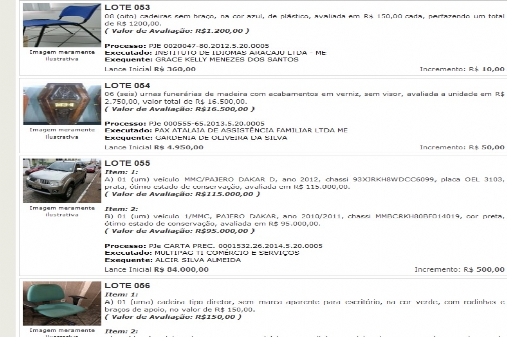 Começou o 17º Leilão Unificado do Tribunal Regional do Trabalho da 20ª Região. No leião que ocorre no TRT estão sendo ofertados imóveis, terrenos, móveis, equipamentos e máquinas para indústria e comércio, veículos automóveis, peças para automóveis, materiais de construção, combustíveis e até mesmo vestidos de noiva, óculos de sol e suplementos musculares.