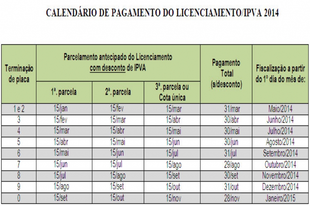 | Pagamento da parcela deverá ser realizado até o dia 15 do mês indicado no calendário de licenciamento (Foto: Detran) |