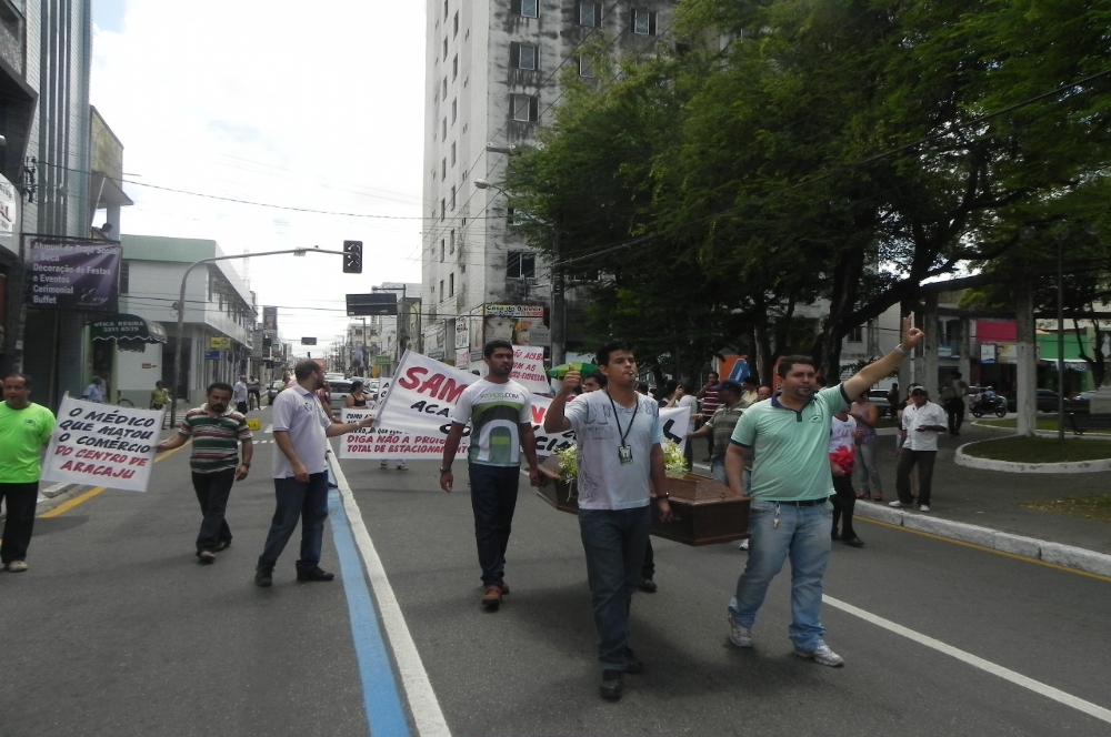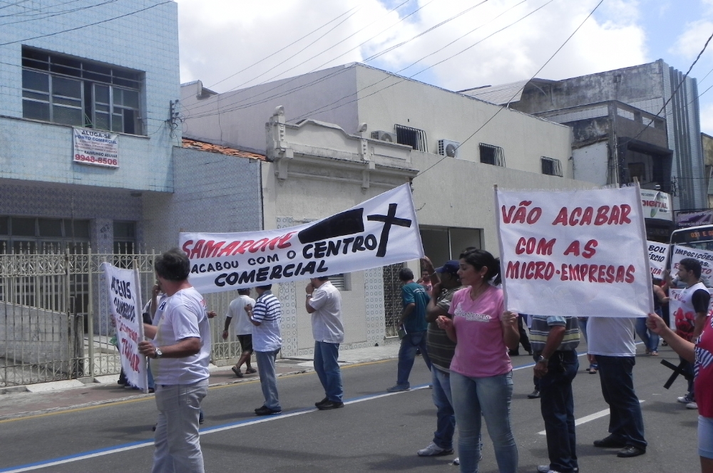 Os comerciantes percorreram as ruas do Centro comercial protestando contra as proibições. Eles utilizaram faixas e um caixão simbolizando o luto dos comerciantes com a determinação, segundo eles, imposta pela SMTT.