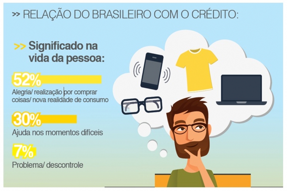 De modo geral, o crédito é definido como algo positivo na opinião da maior parte dos consumidores ouvidos pelo estudo: para 52% dos entrevistados, ele é sinônimo de alegria ou realização de sonhos e para 30%, o crédito serve de ajuda nos momentos de dificuldade. Somente 7% dos entrevistados pensam que o crédito representa alto negativo, que pode causar problemas e incentivar o descontrole.