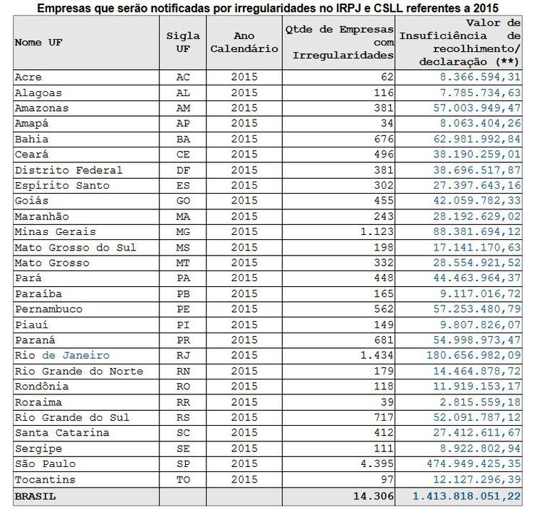 A Receita Federal orienta as empresas com irregularidades no IRPJ e na CSLL dos anos-calendário seguintes a se autorregularizarem. Em junho de 2019, serão iniciadas as ações referentes ao ano-calendário 2015, com envio de cartas para mais de 14 mil empresas que apresentam inconsistências nos recolhimentos e declarações de IRPJ e CSLL de aproximadamente R$ 1,5 bilhão.