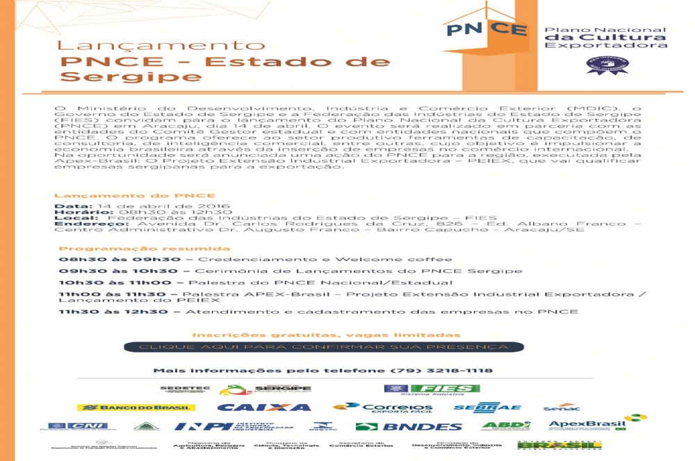 O Plano Nacional da Cultura Exportadora (PNCE) será lançado no próximo dia 14 de abril em Aracaju. O evento que está sendo realizado pelo Ministério do Desenvolvimento, Indústria e Comércio Exterior (MDIC), Governo do Estado – através da Secretaria do Desenvolvimento Econômico e da Ciência e Tecnologia (Sedetec) – e Federação das Indústrias do Estado de Sergipe (FIES) conta com apoio dos Correios e Sebrae e acontece a partir das 8h30 no auditório da FIES, no Centro Administrativo Dr. Augusto Franco, localizado no bairro Capucho, na capital.