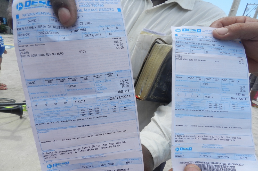 "A minha conta veio cobrando R$ 237 de água e R$ 96 de luz, mas quando eu morava em uma casa alugada aqui mesmo no Lamarão, eu pagava R$ 22 para a Deso e R$ 9 para a Energisa. Não tenho condições de pagar isso. O jeito é deixar cortar", alega o servente André Vieira, que ainda complementa: "com esses valores cobrados dava para tirar um consórcio de um carro novo".