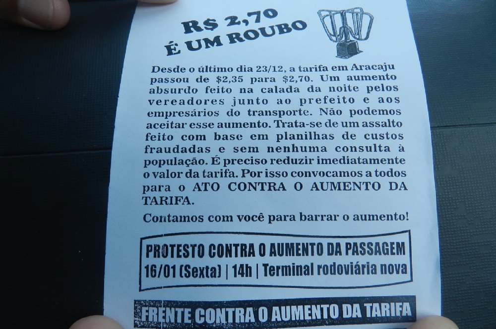 A panfletagem aconteceu em prosseguimento ao calendário contra o aumento da tarifa dos ônibus que circulam em Aracaju [passou de R$ 2,35 para R$ 2,70 em dezembro de 2015].