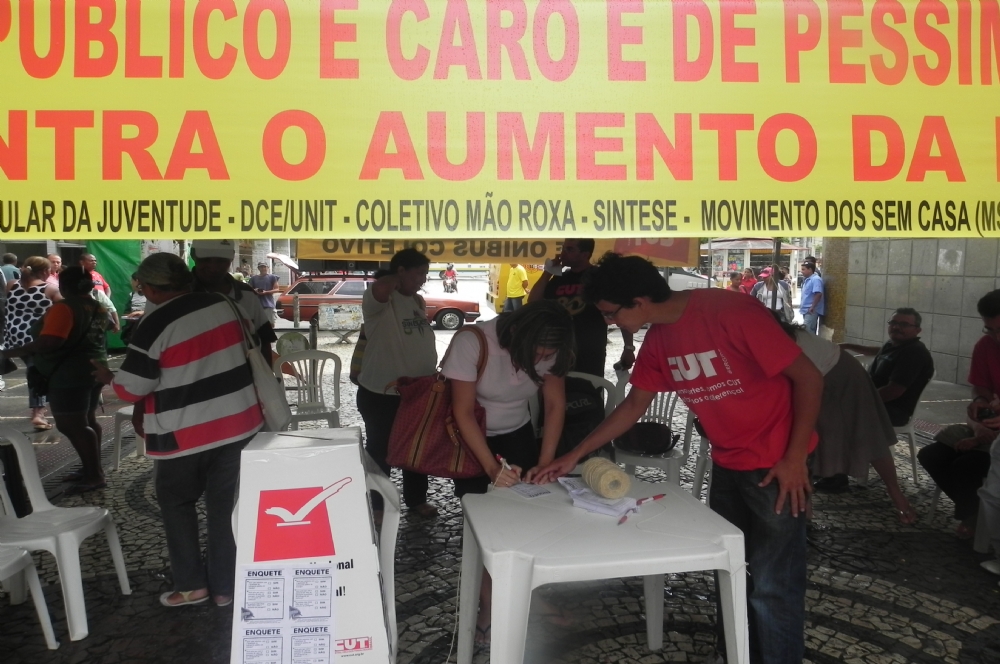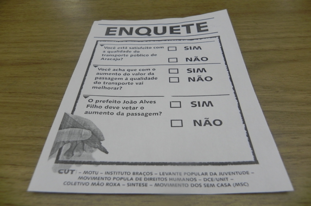 Integrantes da Central Única dos Trabalhadores (CUT), do Movimento dos Trabalhadores Urbanos (Motu), Instituto Braços, Levante Popular da Juventude, Movimento Popular de Direitos Humanos, Diretório Central dos Estudantes da Unit, Coletivo Mão Roxa, Sintese e Movimento dos Sem Casa (MSC) realizaram uma enquete na manhã desta quarta-feira, 15, sobre o reajuste da passagem de ônibus. Movimentos pretendem entrar com ação judicial para que o valor volte a ser de R$ 2,25 e que haja qualidade no sistema de transportes.