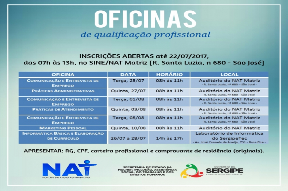 Estão abertas, até o próximo dia 22 de julho, as inscrições para sete oficinas oferecidas gratuitamente pelo SINE/Núcleo de Apoio ao Trabalho (NAT) da Secretaria de Estado da Inclusão Social, em parceria com o Centro Vocacional Tecnológico (CVT) do SergipeTec. As aulas terão início no dia 25 de julho e cada turma tem o limite de inscrições estabelecido em 50 pessoas. Todos os participantes receberão certificados.