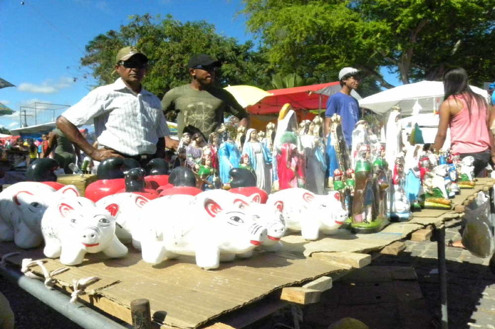 Em sua banca, o comerciante Clécio dos Santos disponibilizava representações de figuras como Nossa Senhora de Fátima, Santo Expedito, Padre Cícero e, obviamente, Nosso Senhor dos Passos. As menores custavam R$ 3; as maiores, R$ 8. Domiciliado em Simão Dias, na divisa com a Bahia, Clécio viaja para São Cristóvão nesta época há dois anos. Para lidar com o negócio, contava neste domingo com a experiência do pai, José dos Santos. “Trabalhei 18 anos nisso. Hoje não faço mais, sou funcionário de uma indústria”, contou José. Ao lado das miniaturas religiosas, pai e filho vendiam ainda cofres para moedas nas formas de caju e do tradicional porco de cerâmica.