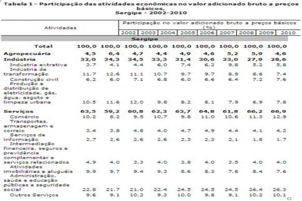 | Tabela 1 – Participação das atividades econômicas no valor adicionado bruto a preços básicos, Sergipe – 2002-2010 |
