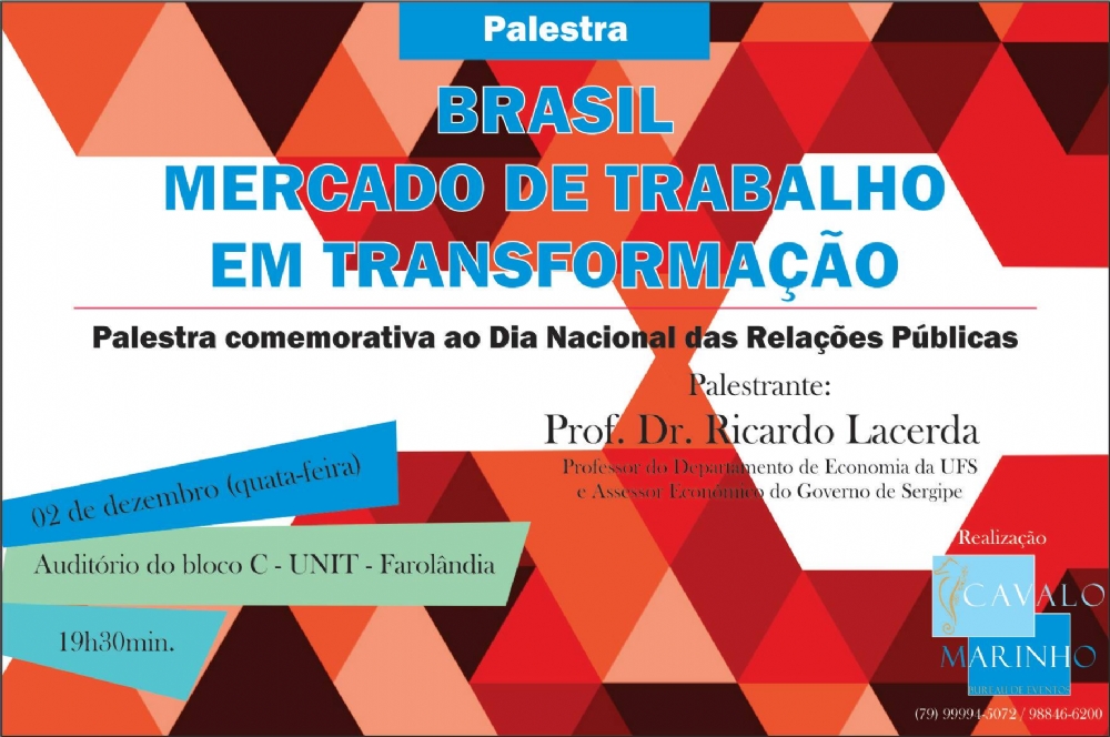 Para marcar a data, a Associação dos Relações Públicas organizou uma palestra com o economista, professor Dr. Ricardo Lacerda, que irá abordar o tema “Brasil, Mercado de Trabalho em Transformação”. O evento acontece dia 02 de dezembro, às 19h30, no auditório do bloco C, da Universidade Tiradentes – Unit, no campi Farolândia, em Aracaju.
