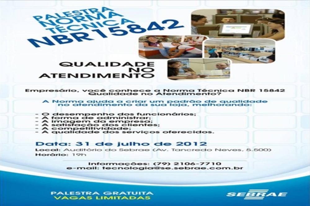 Empreendedores sergipanos terão oportunidade de participar gratuitamente da palestra Norma Técnica NBR 15842 – Qualidade no Atendimento. O evento será realizado no dia 31 de julho, terça feira, no Auditório do Sebrae ás 19h.