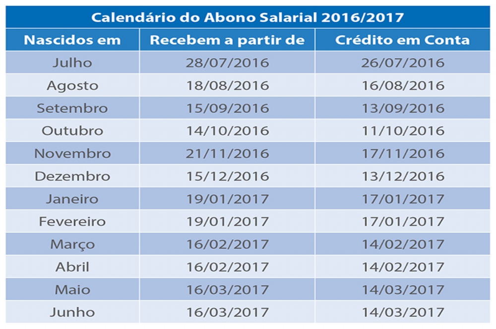 Para saber se tem direito a receber o benefício, que é de até um salário mínimo, o trabalhador pode consultar o site da CAIXA ou ligar no 0800 726 0207, opção 1. No próximo mês, os pagamentos serão realizados a partir do dia 19 para trabalhadores nascidos em janeiro e fevereiro, conforme calendário acima. O calendário deste exercício vai até o dia 30 de junho de 2017.