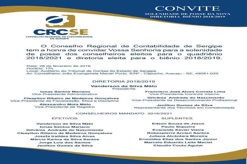 No dia 28 de fevereiro ocorrerá a solenidade de cerimônia de posse da nova diretoria do Conselho Regional de Contabilidade de Sergipe (CRCSE). O evento será realizado no auditório do Tribunal de Contas do Estado de Sergipe (TCE/SE), no dia 28 de fevereiro às 17h.