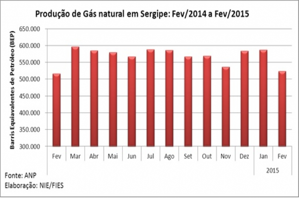 Análise realizada pelo Boletim Sergipe Econômico, parceria do Núcleo de Informações Econômicas (NIE) da Federação das Indústrias do Estado de Sergipe (FIES) e do Departamento de Economia da UFS, com base nos dados da Agência Nacional de Petróleo (ANP), mostrou que a produção de gás natural no estado, em fevereiro de 2015, ultrapassou 524 mil barris equivalentes de petróleo (bep), sendo 10,7% menor, ante janeiro de 2015. Entretanto, na comparação anual, a produção se mostrou 1,5% maior. No primeiro bimestre desse ano, a produção de gás natural apresenta crescimento de 18,6% em relação ao mesmo período de 2014.