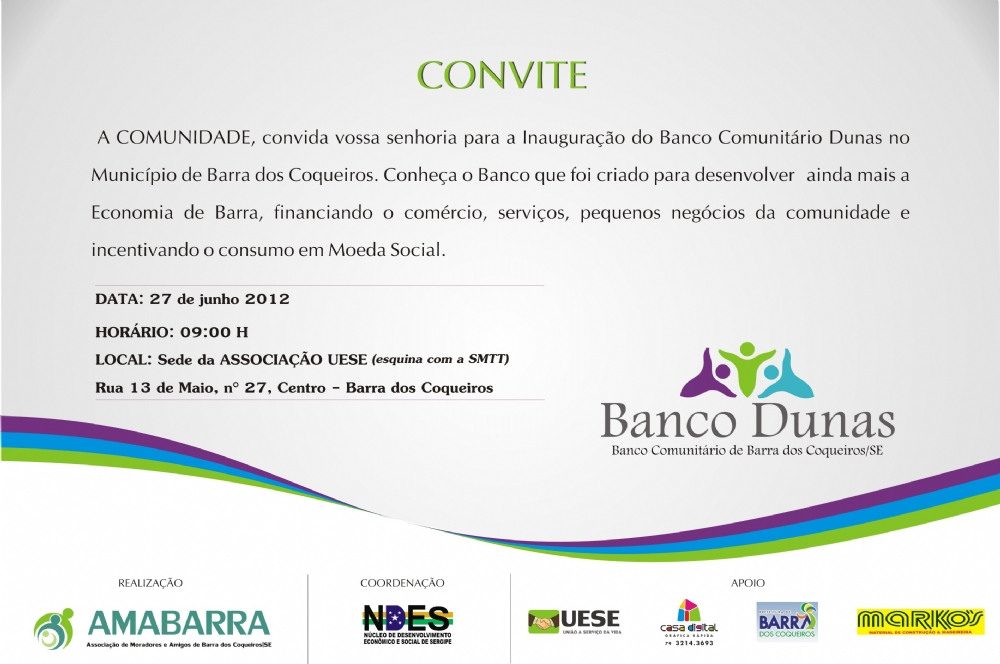 O município de Barra dos Coqueiros será contemplada nesta quarta-feira, 27, ás 9h com o Projeto Banco Comunitário Dunas. O Projeto tem o apoio de algumas associações e da Prefeitura do Município.
