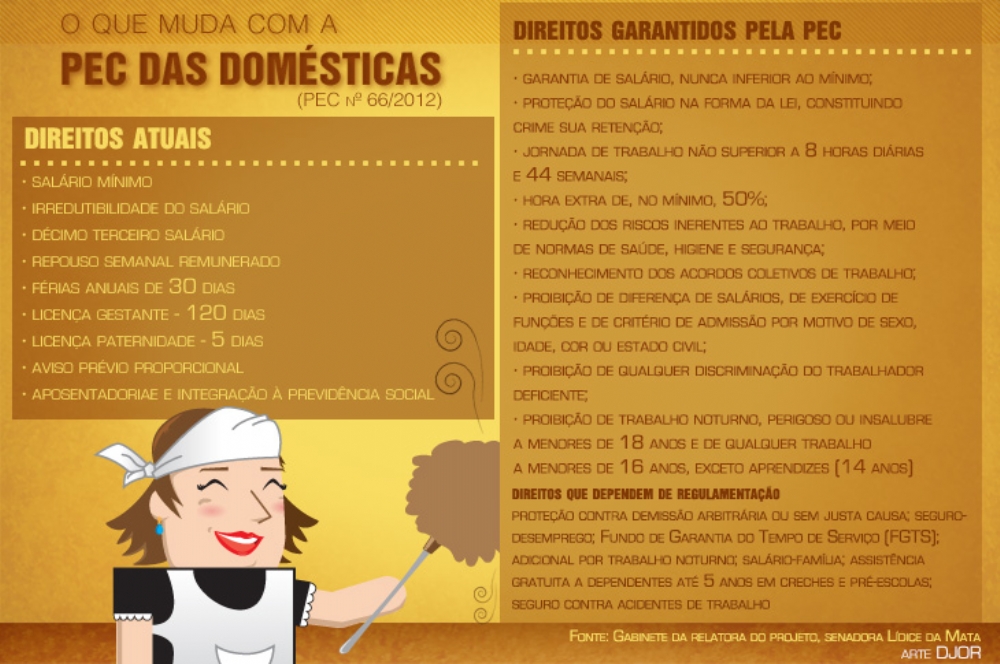 Começam a valer por lei a partir desta quarta-feira, 3, a PEC das Domésticas, a ampliação e os novos direitos aos empregados domésticos no Brasil. O custo para contratar agora, um empregado doméstico, ficou sim mais caro. Os patrões terão ainda que se ajustarem à nova lei que amplia os direitos trabalhistas dos empregados domésticos. Com isso, os empregadores precisarão se adequar às mudanças, que serão publicadas no "Diário Oficial da União", de acordo com o Senado Federal.