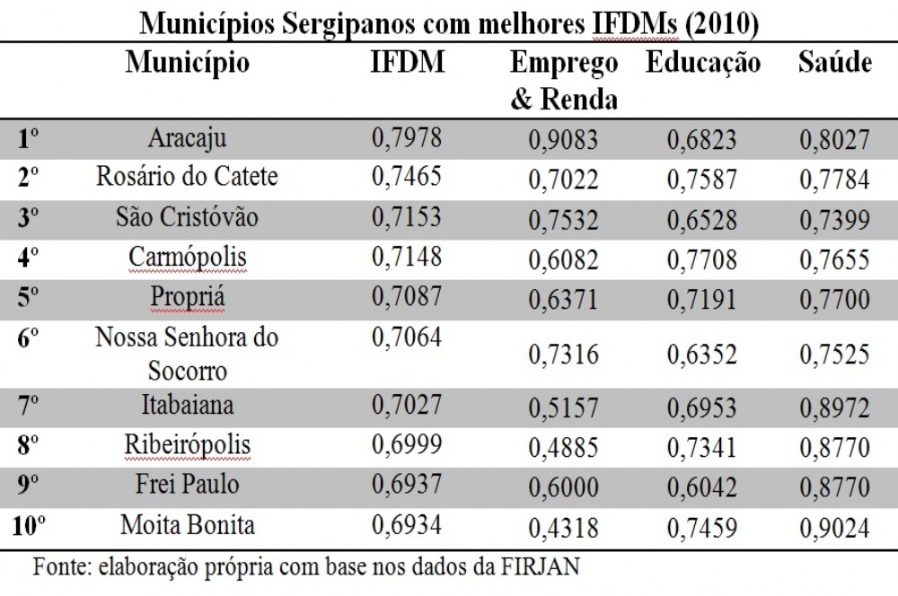 O IFDM é um estudo anual do Sistema Firjan que acompanha o desenvolvimento de todos os mais de 5 mil municípios brasileiros em três áreas: Emprego & Renda, Educação e Saúde; realizado, exclusivamente, com base em estatísticas públicas oficiais, disponibilizadas pelos ministérios do Trabalho, Educação e Saúde. A classificação de Sergipe no índice Firjan de Desenvolvimento Municipal é a mesma de 44,4% dos Estados brasileiros (0,6 a 0,7), sendo que está bem próximo da mediana que é 0,7161.