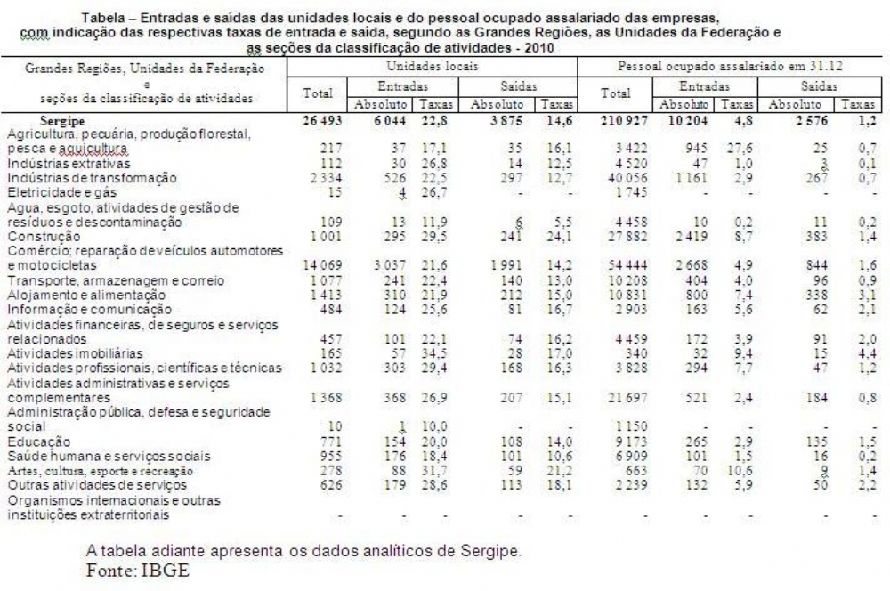 Em Sergipe, no ano de 2010, o cadastro do Cempre apresentou 26.493 empresas ativas que ocupavam mais de 210 mil pessoas, com destaque também, em nível de Nordeste, para o número relevante de sobrevivência dos empregos nas empresas sergipanas. O assalariado em Sergipe possui uma taxa de manutenção do emprego de 95,2%, a segunda maior do Nordeste, com 93,7%, e maior que a taxa do Brasil de 94,8%.