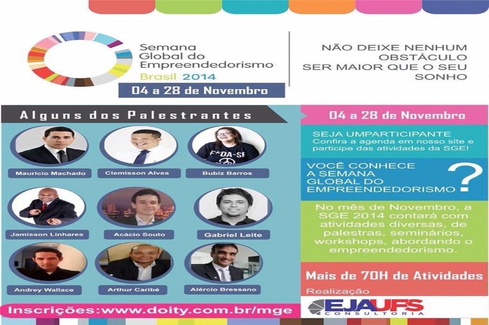 Desde 2007, no primeiro quarto do mês de novembro é comemorada a Semana Global do Empreendedorismo com eventos por todo o mundo. A EJAUFS Consultoria, vêm instigada por este motivo realizar mais uma vez para simpatizantes e empreendedores sergipanos, um evento que segue os moldes internacionais. Contudo, acreditando que uma semana seria muito pouco, decidimos inovar e trazer para todos os interessados um mês inteiro de palestras! Isso mesmo, um mês! Com isso, apresentamos a todos o: Mês do Empreendedorismo Global.
