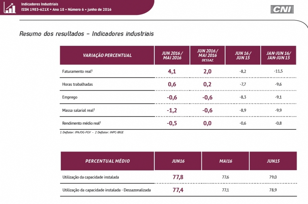 Os dados do primeiro semestre confirmam que a indústria atravessa uma das piores crises da sua história. De janeiro a junho, o faturamento real da indústria teve queda de 11,5% na comparação com o primeiro semestre de 2015. No mesmo período, as horas trabalhadas na produção caíram 9,6%, o emprego recuou 9,1%, a massa real de salários diminuiu 9,9% e o rendimento médio real dos trabalhadores encolheu 0,8%. A utilização da capacidade instalada está 1,2 ponto percentual menor do que a registrada em junho do ano passado.