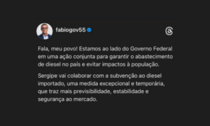 Segundo o governador Fábio Mitidieri, o estado vai colaborar com o subsídio ao diesel, para garantir o abastecimento e evitar impactos à população. “Uma medida excepcional e temporária, que traz mais previsibilidade, estabilidade e segurança ao mercado”, afirmou Mitidieri na publicação.