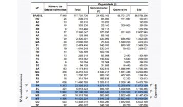 O total da capacidade útil disponível no Brasil para armazenamento em estabelecimentos ativos foi de 177,7 milhões toneladas no segundo semestre de 2019, um aumento de 1,3% em relação ao semestre anterior.