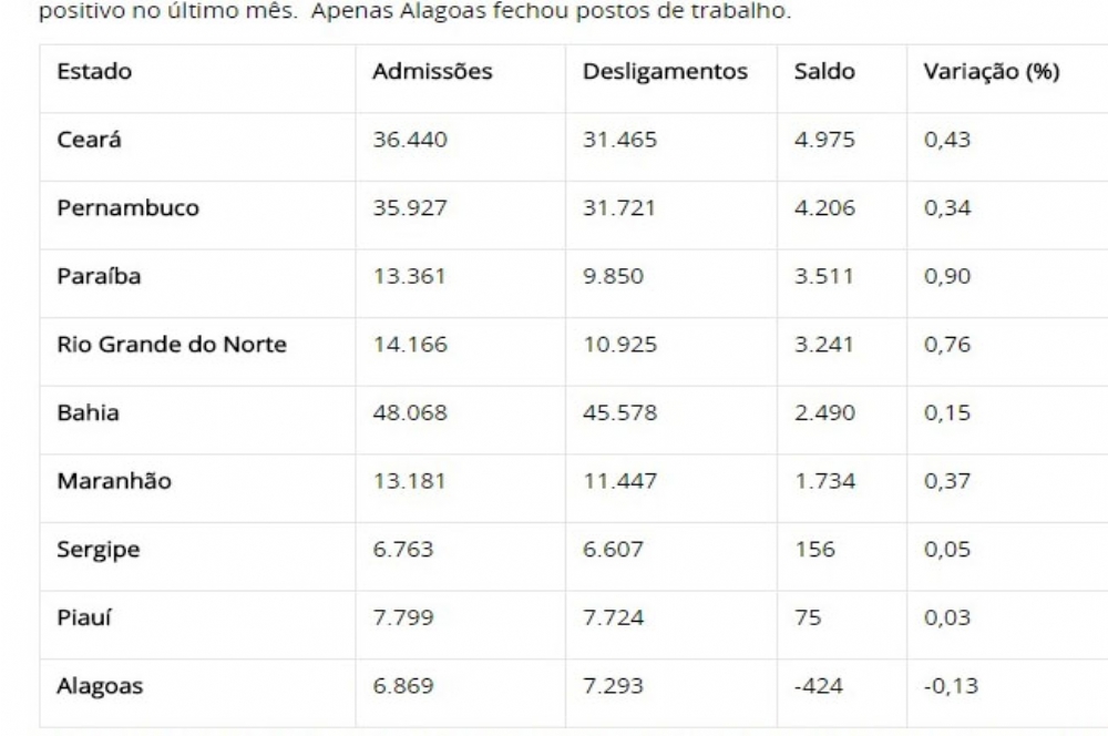 | Tabela mostra saldo da região Nordeste (Foto: Reprodução da tabela do Caged) |