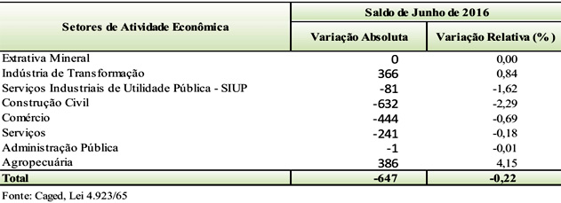 Os setores de atividades que mais contribuíram para a queda nos empregos foram o da Construção Civil (-632 postos), do Comércio (-444 postos) e da Indústria de Transformação (-366 postos), cujos saldos superaram a expansão do emprego nos setores da Agropecuária (+386 postos) e da Indústria de Transformação (+366 postos).