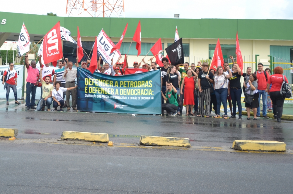 Sindicalistas realizaram, na manhã desta quarta-feira, 30, uma mobilização na sede da Petrobras, no bairro Siqueira Campos, pela redução dos preços do gás de cozinha, da gasolina e do diesel.