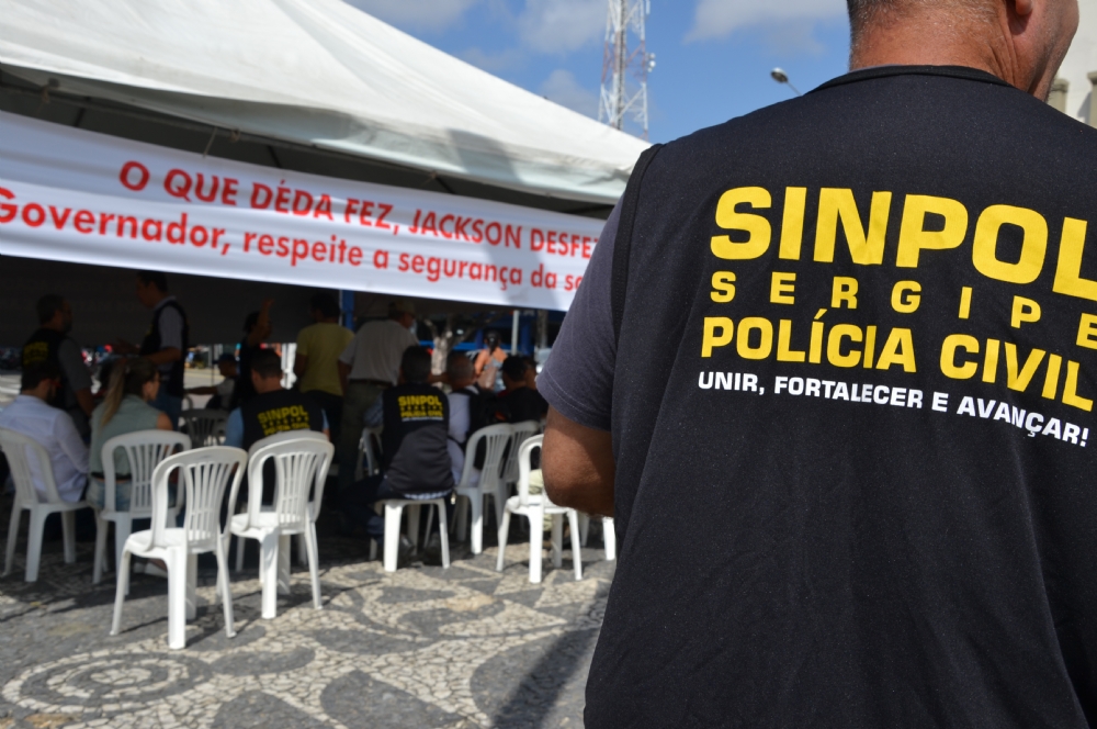 O Sindicato dos Agentes de Polícia Civil do Estado de Sergipe (Sinpol) realizou uma manifestação nesta quarta-feira, 17, no centro de Aracaju, em protesto à suposta morosidade do Tribunal de Justiça para julgar ação judicial movida pelo sindicato contra o parcelamento e atraso de salários dos servidores públicos vinculados à Secretaria de Estado da Segurança Pública.