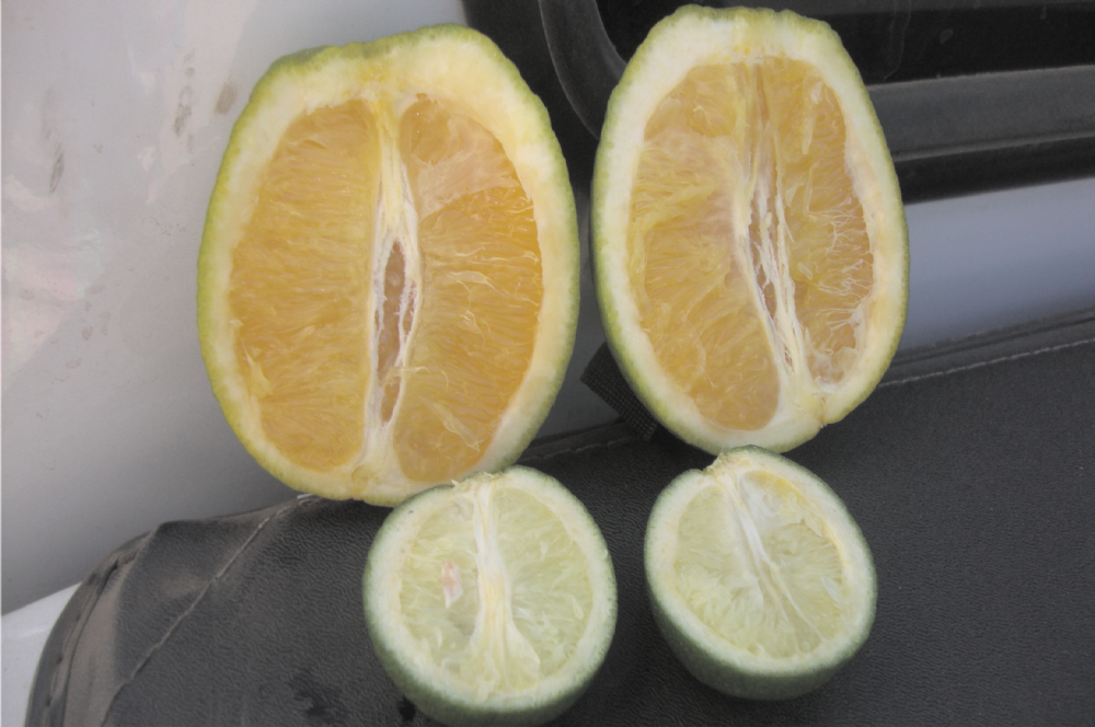 Segundo ela, uma vez afetado o ramo, a bactéria se espalha por toda a planta, atingindo a copa, tornando a produção desprezível. “Mesmo apresentando sintomas em um único ramo da planta, a bactéria já pode estar alojada bem abaixo no tronco e raízes e, uma vez contaminadas as plantas novas não chegam a produzir e plantas adultas tornam-se improdutivas em 2 a 5 anos. Os frutos podem apresentar internamente diferença de maturação nas diferentes partes, ou seja, ter um dos lados maduro e o outro verde, além de ficar deformado, pequeno e assimétrico”, detalhou Aparecida.