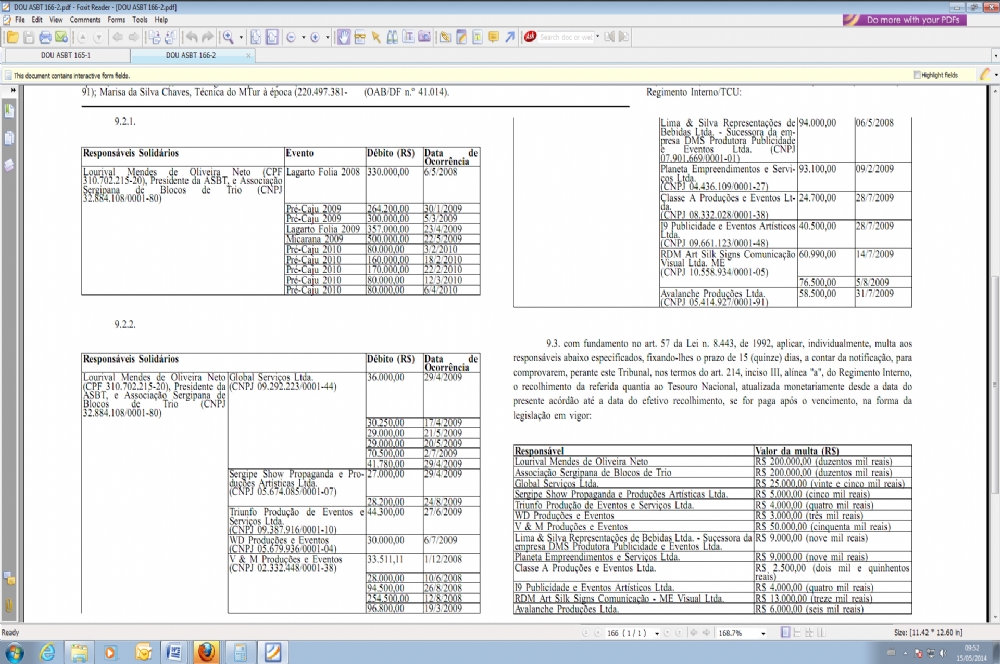 O Portal Infonet tentou, sem sucesso, ouvir todas as empresas e pessoas físicas citadas no acórdão de número 1254/2014 da Segunda Câmara do TCU, referente à tomada de contas especial decorrente da conversão de processo fiscalização (TC 014.040/2010-7), relativo à auditoria realizada, no âmbito da Secretaria de Controle Externo no Estado de Sergipe (Secex/SE), para verificar a conformidade legal das transferências voluntárias do Ministério do Turismo para a ASBT.