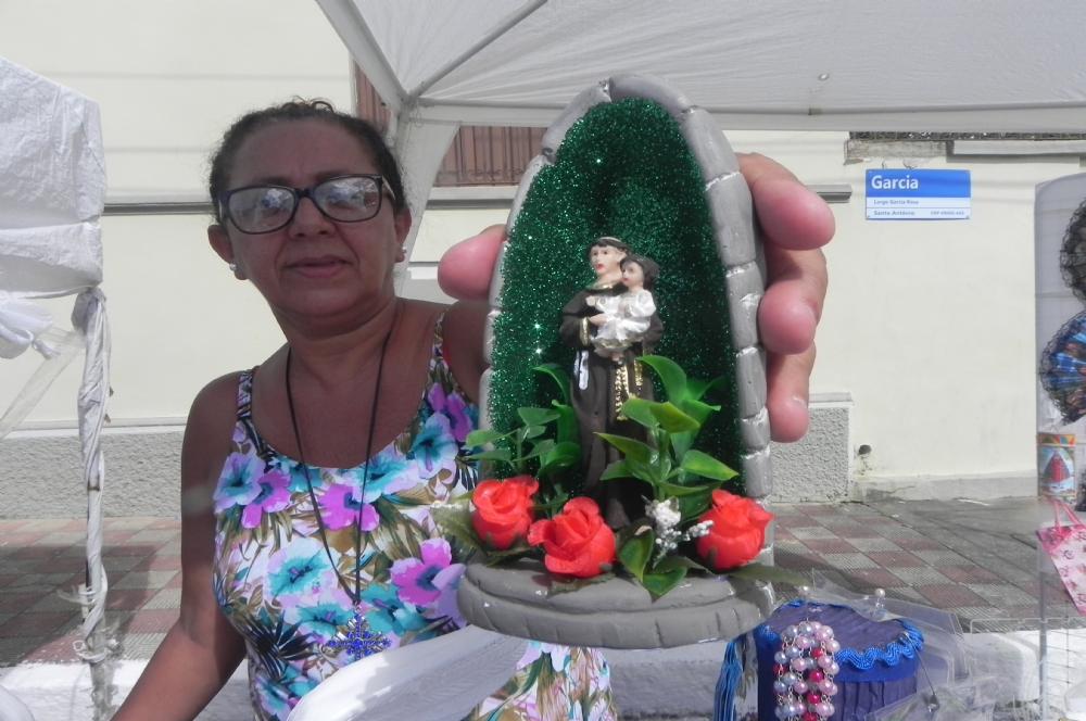 A artesã Ana Lúzia Almeida, 56, também participa de todos os dias da trezena e diz que, além de ser agraciada por participar dos festejos, consegue uma renda extra. “É uma graça estar com o povo católico. Também produzo material reciclado e garanto um dinheiro para melhorar as coisas em casa”, diz, satisfeita, a artesã.