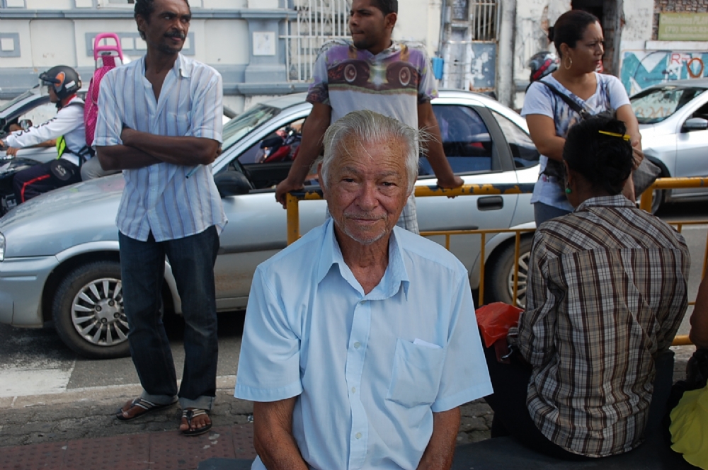 | O aposentado Aurelino Pereira descansa no ponto do ônibus para enfrentar caminhada |