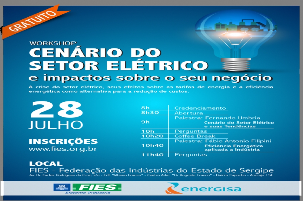 Preocupada com o cenário atual, a Federação das Indústrias do Estado de Sergipe (FIES) em parceria com a ENERGISA realiza no próximo dia 28 de julho o Workshop: Cenário do Setor Elétrico e impactos sobre o seu negócio. O encontro tem como tema “A crise no setor elétrico, seus efeitos sobre as tarifas de energia e a eficiência energética como alternativa para a redução de custos”.