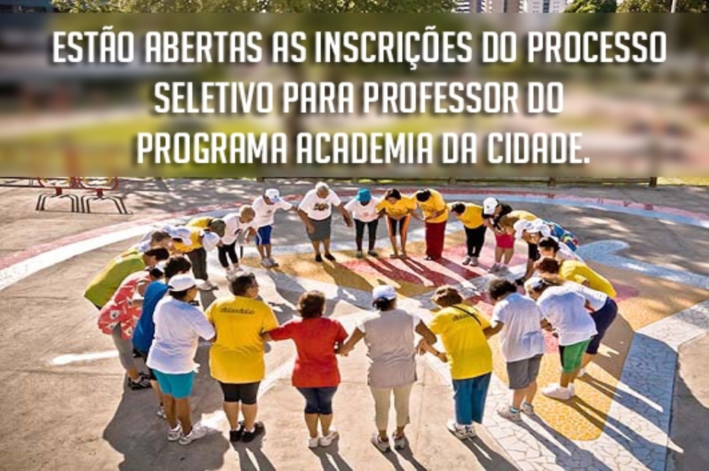 Estão abertas as inscrições para o processo seletivo de educador físico, para preenchimento de vagas no Programa Academia da Cidade. O profissional deve ter formação em licenciatura plena ou bacharelado em educação física.