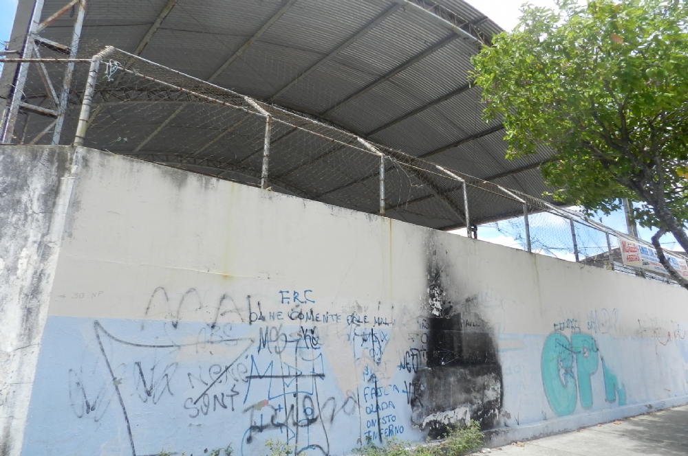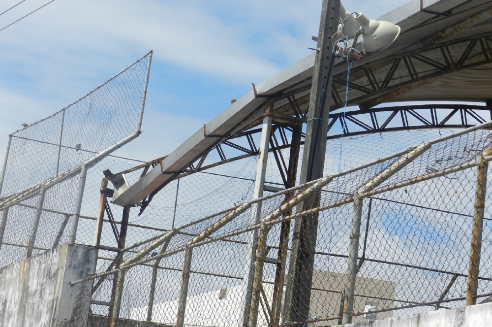 Por conta da falta de estrutura, a quadra da escola teve que ser interditada para evitar possíveis desabamentos. No local é possível perceber que a tela de proteção da quadra encontra-se em precárias condições.