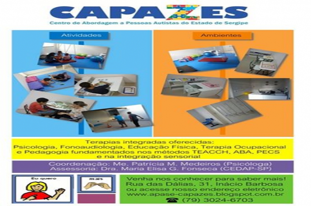 Criada há dois anos por país de alunos autistas e sem fins lucrativos, a APASE oferece, no Capazes, situado na Rua das Dálias, nº 31, Inácio Barbosa, várias modalidades terapêuticas de abrangência generalista, baseadas nos métodos Teacch, Aba, Pecs e na integração sensorial, para acompanhar crianças e adolescentes com a necessidade.